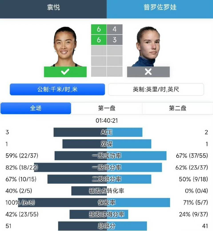 赛后技术统计,袁悦在发球稳定和关键分把握上表现非常不错,她全场发出了4记Ace球,没有出现双误,这与她在澳网比赛中二发得分率仅47%的表现形成鲜明对比。袁悦在破发点把握上效率惊人。她全场共获得五个破发机会,成功兑现四个,破发成功率高达80%。而普罗佐罗娃虽然获得了七个破发点,但只成功破发一次。